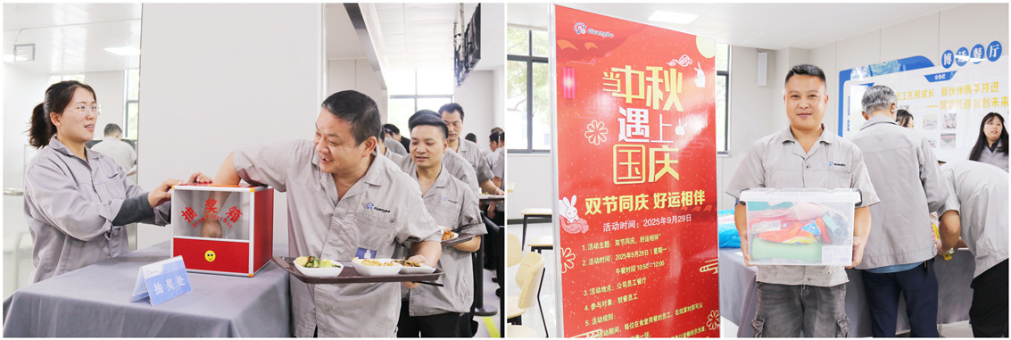 2025年国庆、中秋双节同至,为保障订单的顺利交付,公司生产一线员工全员坚守岗位,持续投入生产。为表达对员工的感谢与关怀,公司组织开展了福利发放与系列趣味活动,在传递节日祝福的同时,进一步增强了团队凝聚力,营造了温馨和谐、积极向上的节日氛围。